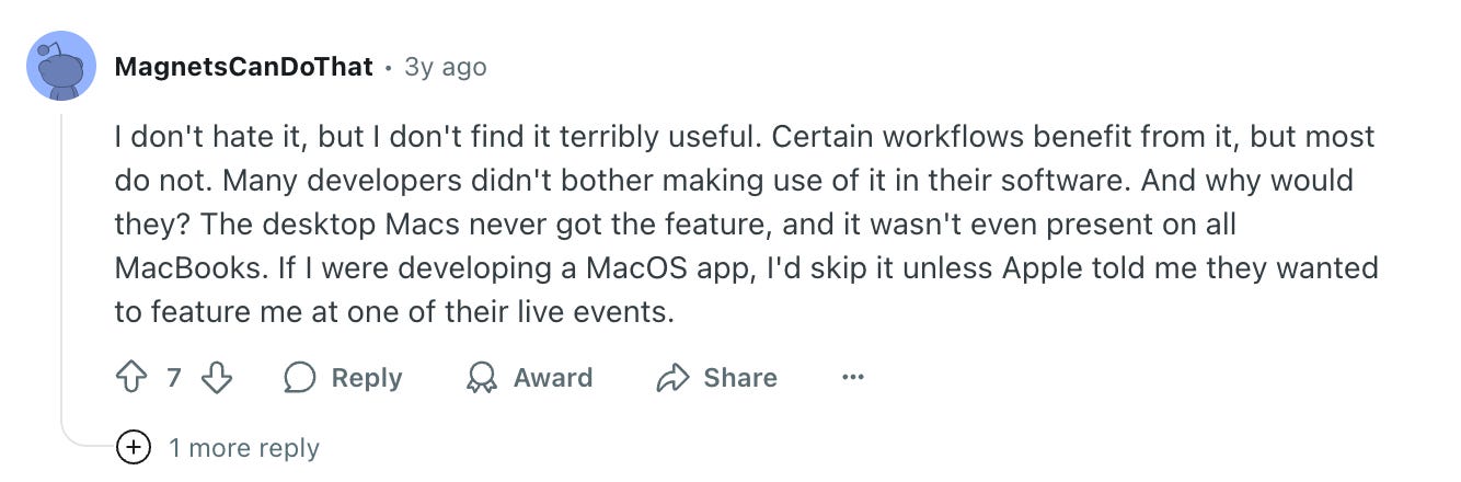 Let’s look at why the Touch Bar’s reception was so divided. While some people loved the idea, many others found it awkward or just plain unnecessary. This is a classic example of the gap between a cool innovation and what people actually find useful day-to-day.